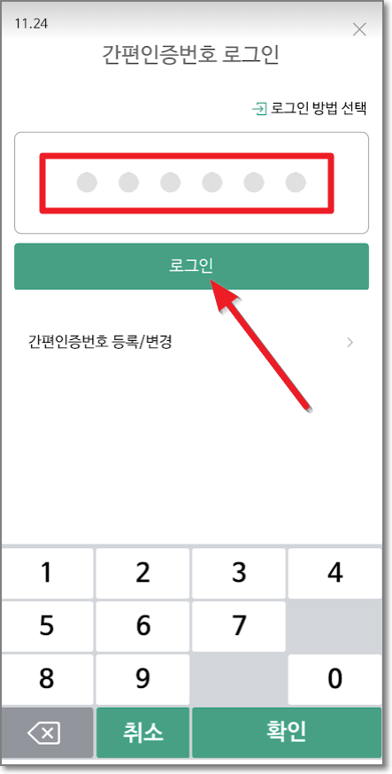 휴대폰에서 "나무 앱"을 실행하고 "로그인"을 터치해서 미리 만들어둔 간편 인증번호 로그인 번호를 입력 후에 로그인을 합니다.