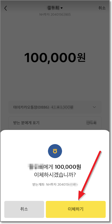 NH투자 나무 계좌를 정확히 적고 10만 원을(또는 원하는 금액) 이체합니다.