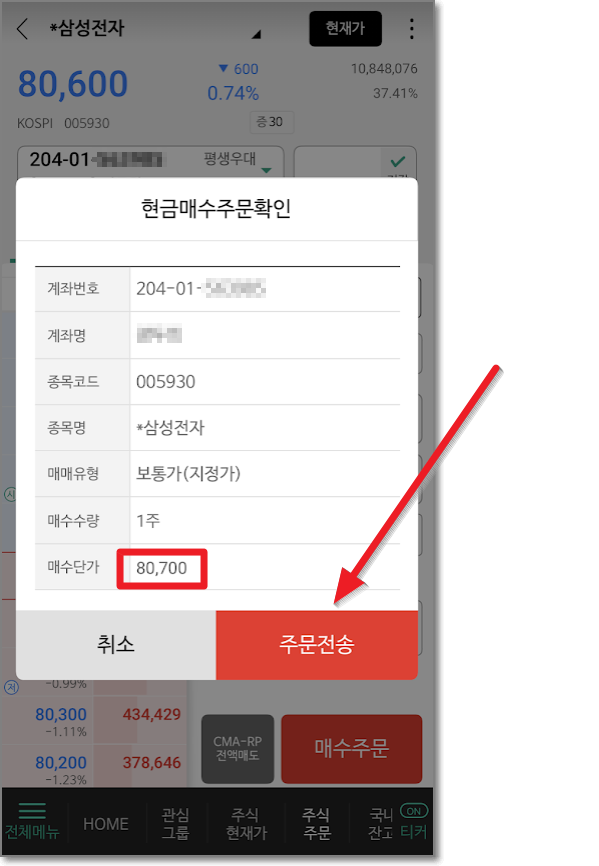 80,700원인 삼성전자 보통주를 1주 입력하고 "매수주문"을 눌러서 "현금매수주문 확인"을 확인하고 "주문전송"을 누릅니다.