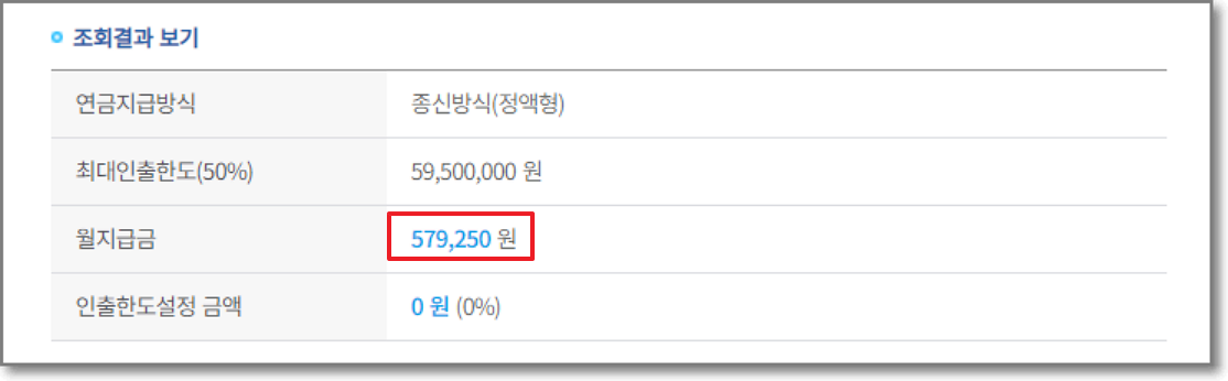5억짜리 집을 55세부터 종신까지 받겠다고 신청하면 월 579250원을 지급하게 됩니다.