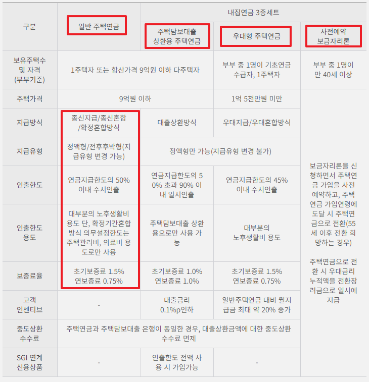 일반주택연금과 주택담보대출상환용 주택연금, 우대형 주택연금, 사전예약 보금자리론이 있습니다.