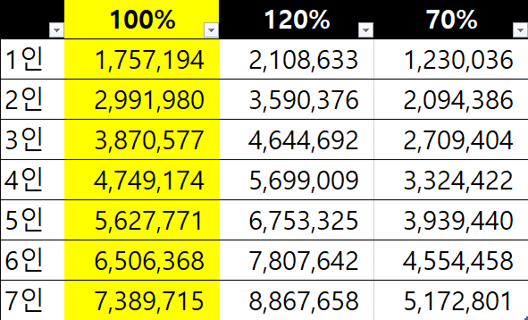 따라서 기준 중위소득 100%는 저 금액 그대로를 의미하며 120%는 120%만큼 많은 소득, 70%는 70%만큼 적은소득을 의미하며 표로 나타내보면 다음과 같습니다.