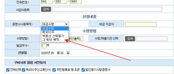 그리고 "증명서사용목적"을 선택해야 합니다. 아래에서 "그밖의 목적"으로 선택하시면 됩니다.