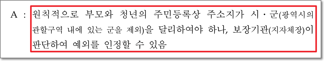A : 원칙적으로 부모와 청년의 주민등록상 주소지가 시․군(광역시의 관할구역 내에 있는 군을 제외)을 달리하여야 하나, 보장기관(지자체장)이 판단하여 예외를 인정할 수 있음