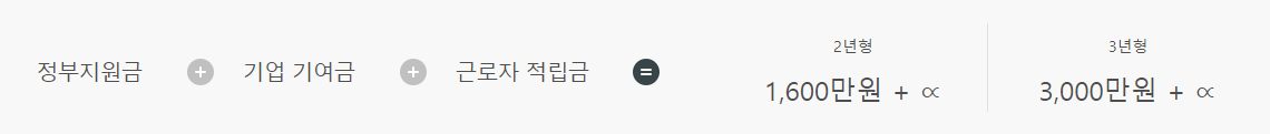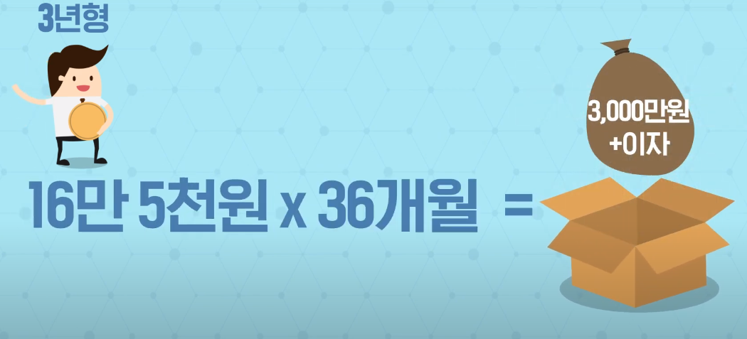 다시 말하면, 중소기업이나 중견기업을 다니는 청년이 2년간 매월 12만5000원씩 300만원을 적립할 경우 정부와 기업의 지원을 통해서 만기 때 총 1600만원의 만기공제금을 받을 수 있게 한 것이며, 3년간 매월 16만5천원을 적립할 경우 3000만원의 만기공제금을 받을 수 있게 한 것입니다.