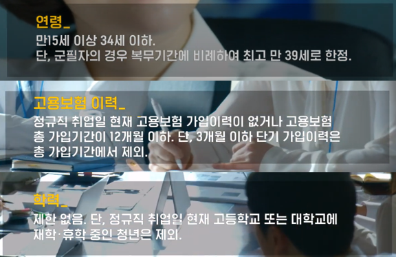 지원대상인 청년의 기준은 만15세 이상 만 34세 이하를, 기업은 직원 수가 5인 이상인 중소.중견기업을 대상으로 합니다. 군필자의 경우 복무기간에 비례해서 참여제한 연령을 연동해서 적용하는데 가능한 최고 연령은 39세 입니다.