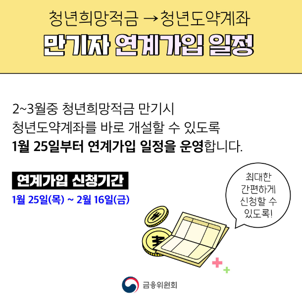 금융위원회에 따르면, 청년희망적금의 만기 수령자 중 청년도약계좌의 가입요건을 충족하는 경우, 오는 25일부터 연계가입을 신청할 수 있습니다. 청년도약계좌의 가입요건은 만 19세에서 34세 사이이며, 개인소득이 7500만 원 이하인 경우에 해당합니다.