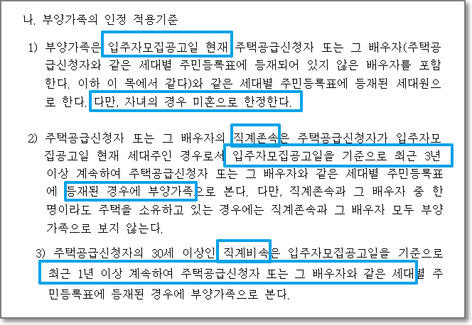 두번째로 부양가족을 보면, 입주자모집공고일 기준 같이 등재되어야 하는것도 중요하지만, 직계존속 즉 부모님 같은 경우에는 최근 3년이상 계속 등재되어있어야 부양가족으로 되며, 직계비속 즉 자식의 경우에는 30세 이상일 경우 최근 1년이상 같은 주소지에 등재되어있어야 합니다. 즉, 입주자 모집 공고일 다가온다고 해서 부모님이나 배우자의 부모님을 모신다고 등재해봤자 가점에는 전혀 영향이 없다는 점 꼭 참고해주세요.