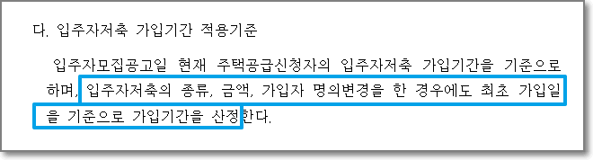 세번째로 청약저축의 경우 과거에 청약부금을 들거나 다른 청약관련 저축을 들었더라도, 심지어 가입자 명의변경을 했어도 최초가입일을 기준으로 가입기간을 산정하게 됩니다.