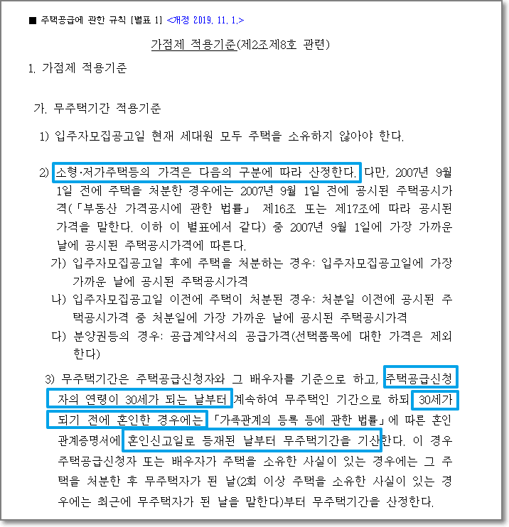 첫번째로 무주택기간에 대한 내용입니다. 읽다보면, 소형,저가주택이라는 내용이 나오는데, 이는 전용면적 60제곱미터 이하이면서 수도권은 1억3천만원 이하, 수도권외 지역은 8천만원 이하이면 "무주택"으로 인정해줍니다.