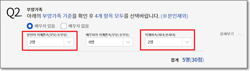 부모와 같이 산지 3년이상이 되야 인정받는다는점 꼭 기억하시고요. 부양가족이 배우자까지 총 5명이므로 기본 5점에 부양가족수 곱하기 5해서 30점 입니다.