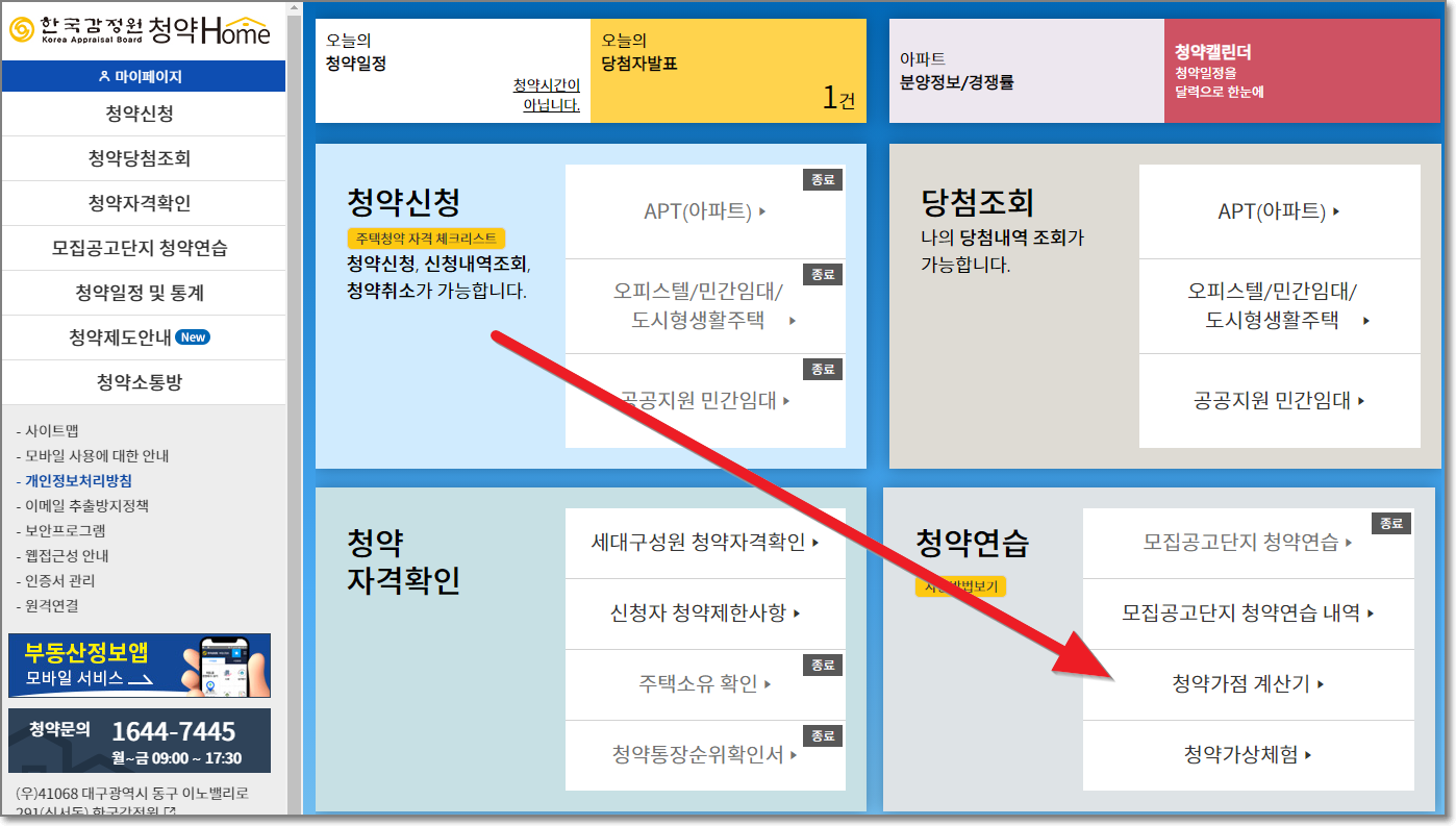 링크를 누르면 한국감정원이 열릴텐데요. 아래 화면에서 화살표친 청약가점 계산기를 누릅니다.