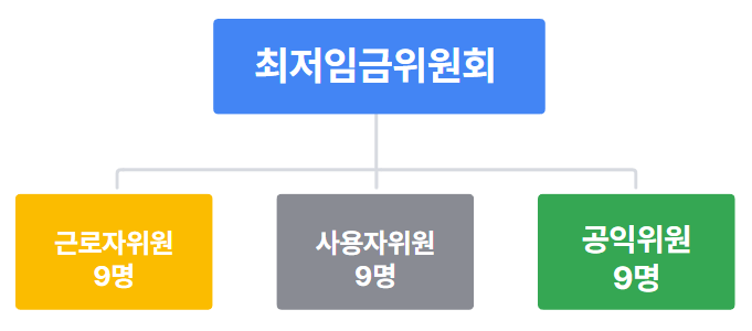 최저임금은 정부에서 일방적으로 결정하는 것이 아니고 노동계(근로자위원)와 경영계(사용자위원) 그리고 공익위원이 각각 9명씩 총 27명이 참여하여서 최저임금위원회를 구성하고 노동계와 경영계가 요구안을 좁혀나가면서 결정하는 방식입니다.(특별 위원 3명이 있지만 투표권은 없습니다)