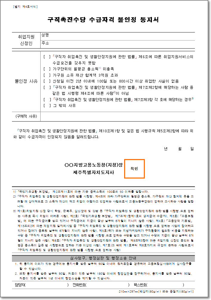구직촉진수당 수급자격 불인정 통지서