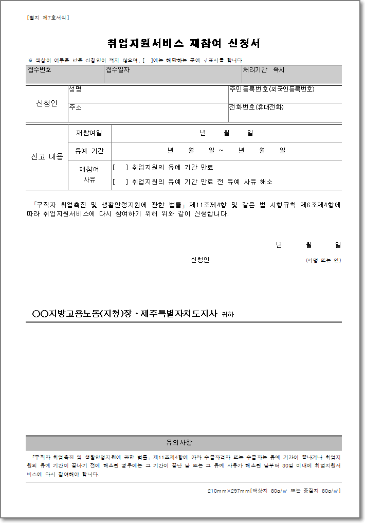1. 별지 제7호(취업지원서비스 재참여 신청서)