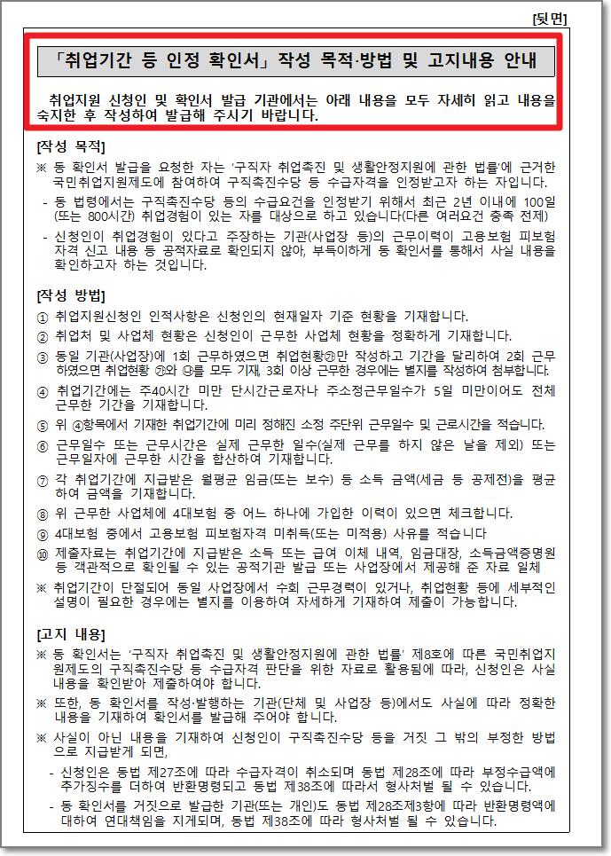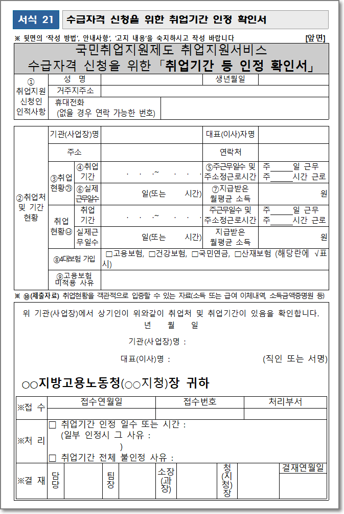1. 수급자격 신청을 위한 취업기간 인정 확인서