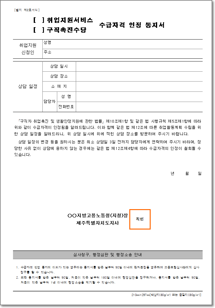 구직촉진수당 수급자격 인정 통지서