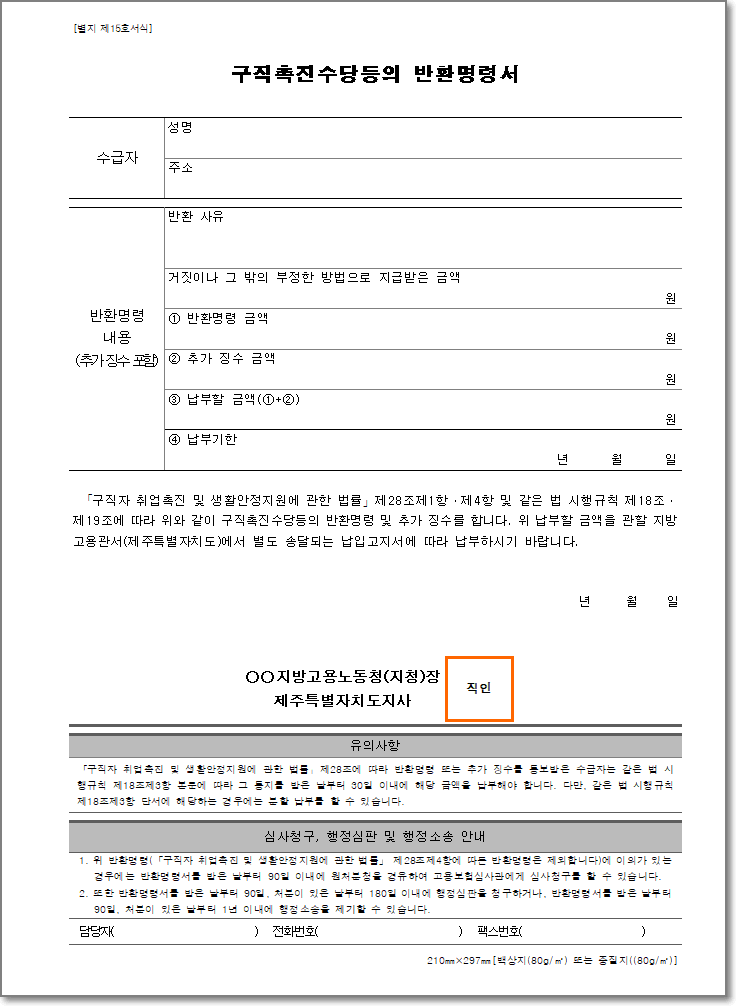 구직촉진수당등의 반환명령서