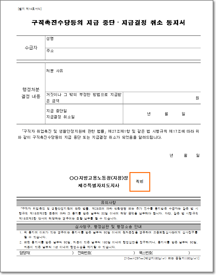 구직촉진수당등의 지급 중단 지급결정 취소 통지서
