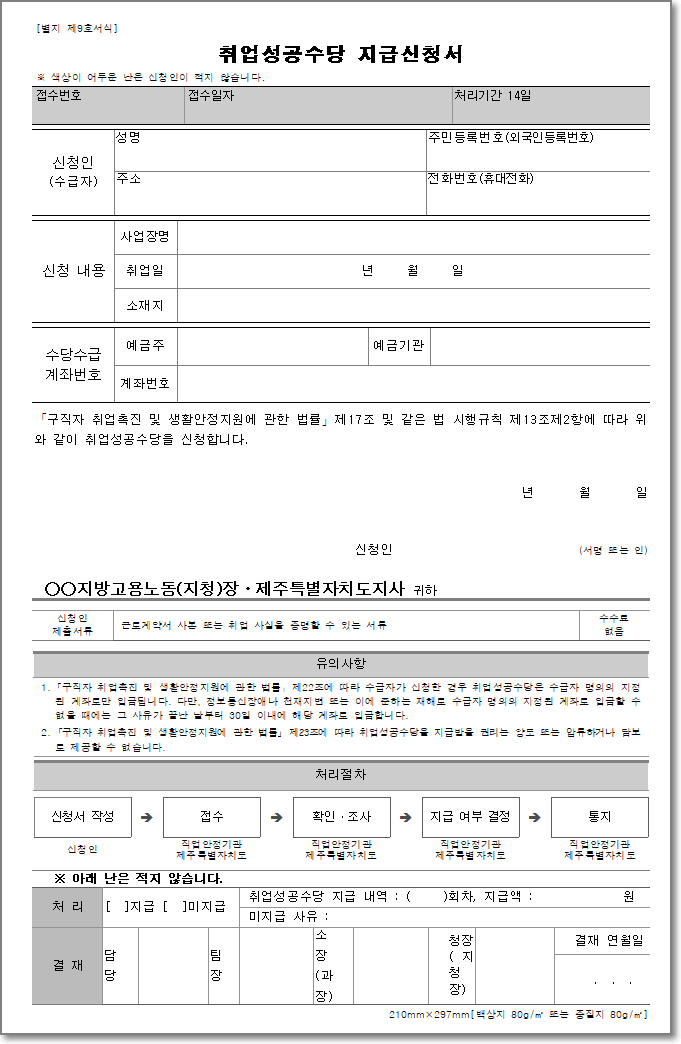 1. 별지 제9호(취업성공수당 지급신청서)