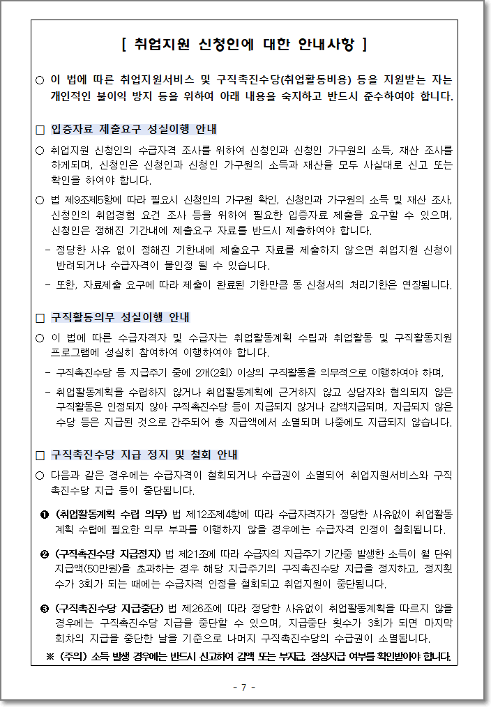 1. 별지 제7호(취업지원서비스 재참여 신청서)