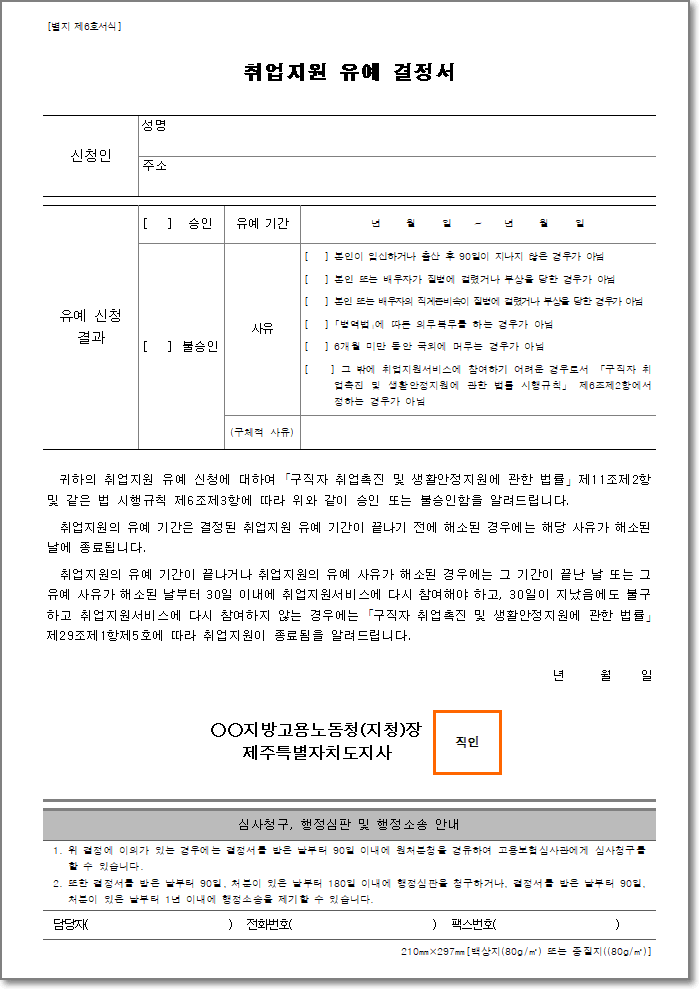 취업지원 유예 결정서