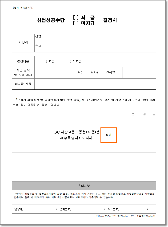 별지 제10호(취업성공수당 지급, 미지급 결정서).hwp