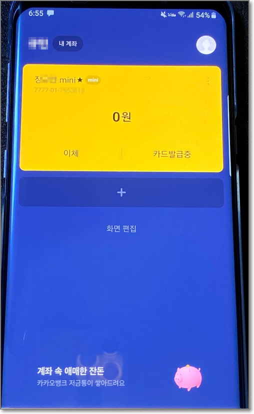 이제 드디어 카드 발급 신청이 끝났습니다. 카카오 뱅크를 보면 계좌번호도 있는 것을 보실 수 있습니다. 통장이 하나 생긴 것입니다.