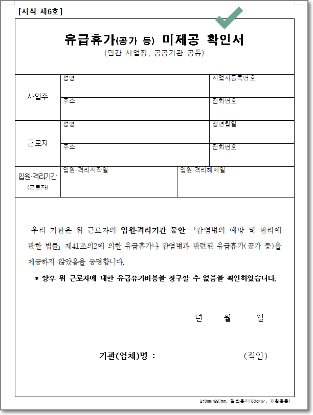생활지원비 신청서 아래쪽에 보시면 유급휴가를 제공받지 않았음 이라는 곳에 체크하게 되어있는데요. 이 때 함께 제출해야 하는것이 '유급휴가 미제공 확인서'입니다. 지자체에 따라 내지 않아도 되는곳도 있으나 필요로 하는곳도 있습니다. 필요하신 경우 아래 파일을 다운로드 하시면 됩니다.(PDF파일과 HWP파일이 준비되어 있습니다.)
