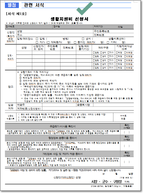 코로나 자가격리 지원금(생활지원비, 생활지원금)을 신청하기 위해서는 주민등록등본을 떼었을 때 나오는 자신의 주소지에 있는 동사무소(행정복지센터)를 방문해서 신청해야 합니다만 비대면이 일상화된 현재는 이메일 또는 팩스로 신청할 수 있게 되어있습니다. 해당하는 행정복지센터 사회복지 담당자에게 통화를 하면 해당 지자체의 양식을 이메일로 받을 수 있지만 대부분의 양식이 동일하므로 아래에서 코로나 생활지원비 신청서와 유급휴가 미제공 확인서 그리고 대리인으로 갈 때 필요한 위임장 서식을 알아보겠습니다.
