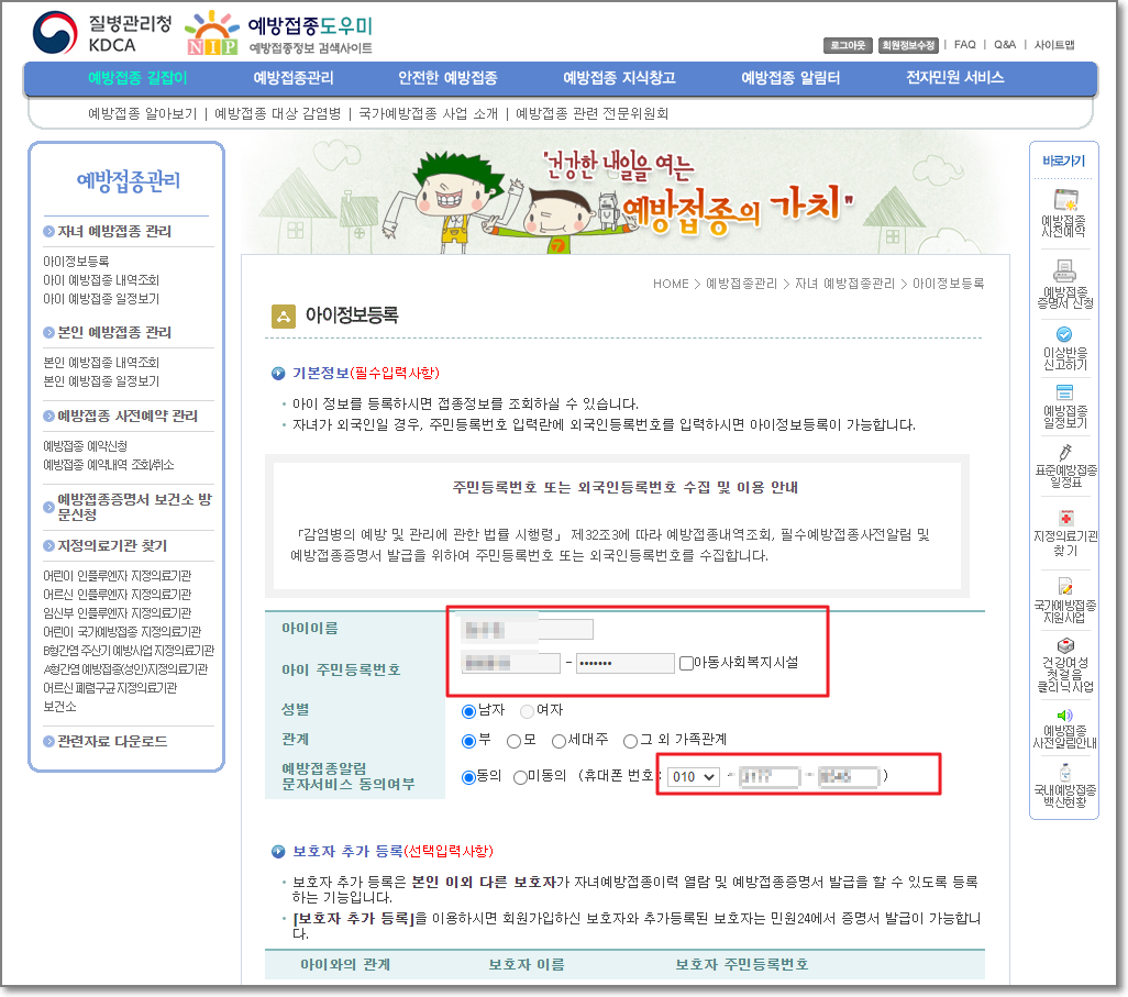 아이의 이름과 주민번호가 나오고 밑에 그동안 맞은 "접종정보"가 나옵니다.