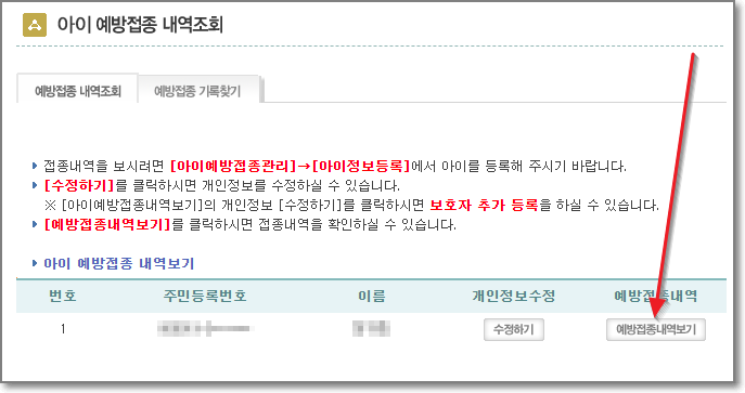 그럼 방금 등록한 아이의 내역을 보실 수 있게 됩니다. 화살표친 "예방접종내역보기"를 누릅니다.