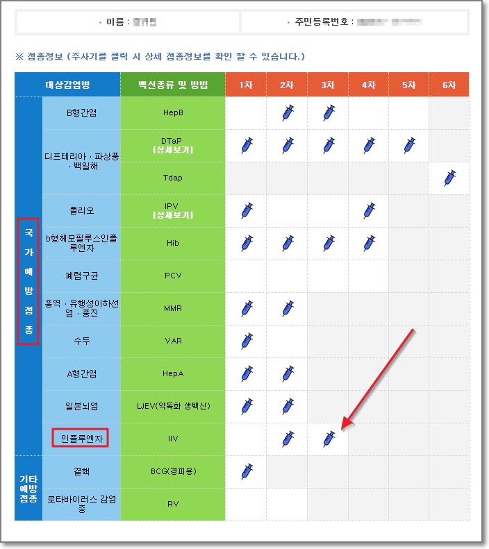 아이의 이름과 주민번호가 나오고 밑에 그동안 맞은 "접종정보"가 나옵니다.