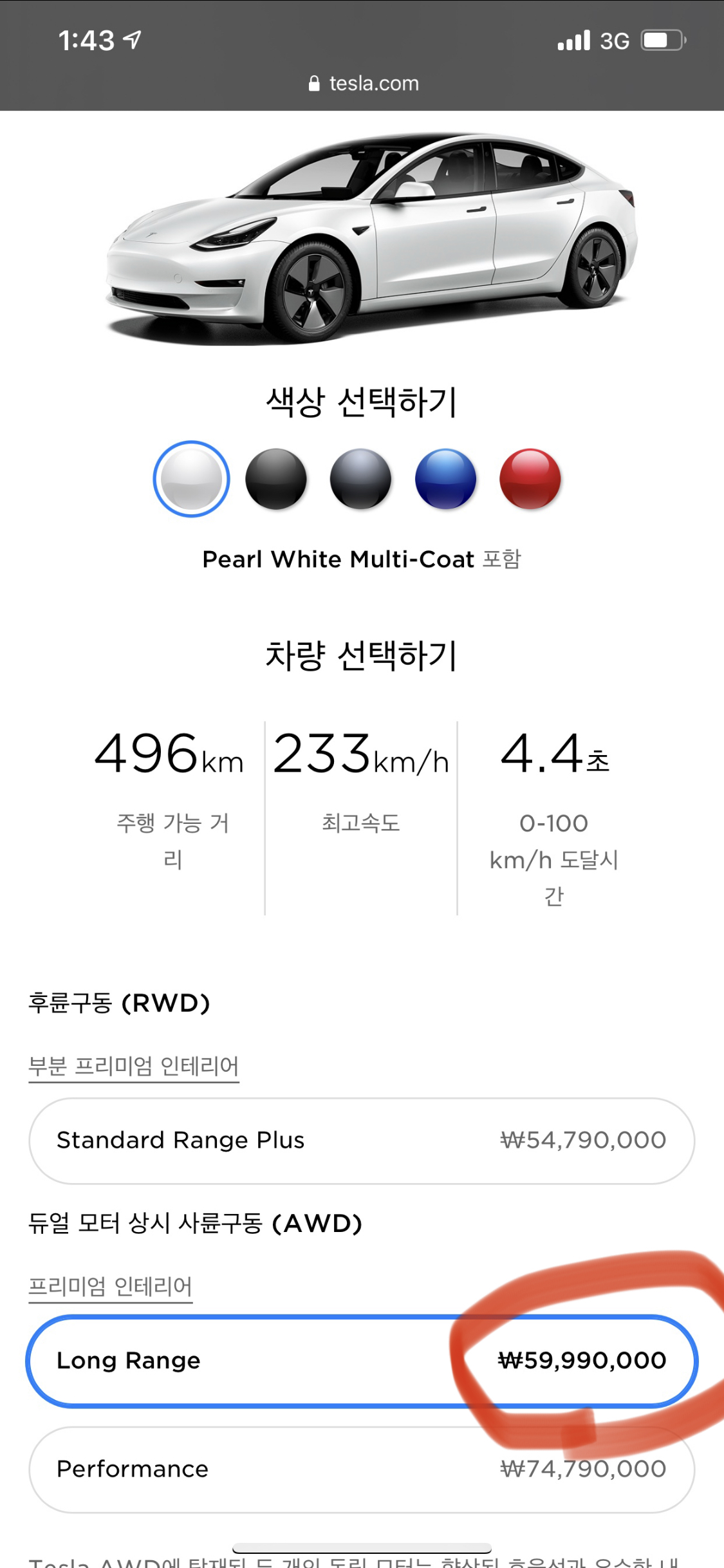 여기서 롱레인지는 5999만원으로 바뀌었습니다.