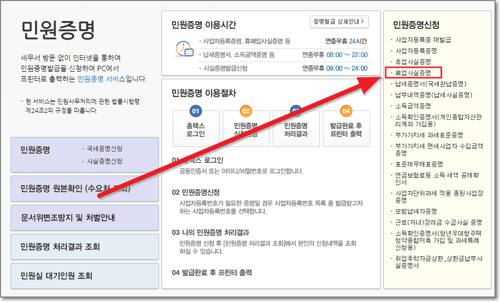 민원증명 화면에서 오른쪽을 보면 "민원증명신청"에서 "폐업사실증명"을 누릅니다.