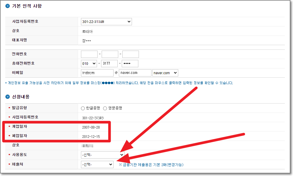 사업자번호를 선택하면 아래처럼 상호명과 "개업일자", "폐업일자"가 나옵니다. 발급유형은 한글인지 영문인지 필요한 사항으로 입력하시고(저는 한글증명입니다.)밑에 있는 사용용도와 제출처를 각각 누릅니다.