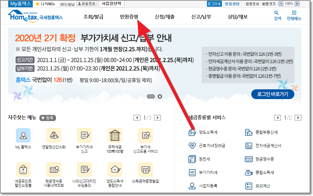국세청홈택스에 접속해야 합니다. 국세청홈택스 글씨에 바로갈 수 있도록 해놓았으니 눌러서 새창을 여세요. 그러면 아래와 같은 화면이 나오는데 여기서 "민원증명"을 누릅니다.