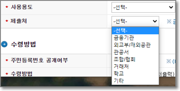 사용용도와 제출처를 상황에 맞게 선택을 합니다.