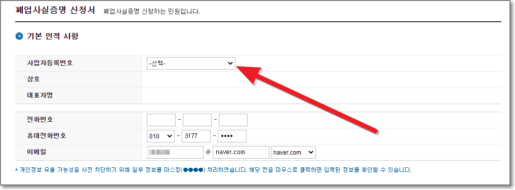 폐업사실증명 신청서에서 "사업즈등록번호"에 보면 -선택-이라고 되어있는 부분을 누릅니다.