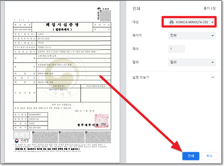 곧 연결되어 있는 프린터가 소리를 내면서 프린트를 하게 됩니다. 그리고 아래처럼 "폐업사실증명"이 프린트되어 나옵니다.