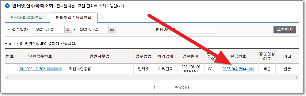 신청하시겠습니까? 정상적으로 신청되었습니다. 가 나온 후에 아래처럼 나옵니다. 발급번호를 누릅니다.