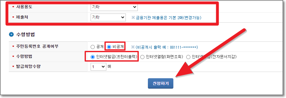 저는 통신사에 제출할 것이라서 사용용도와 제출처를 모두 "기타"로 하였습니다. 주민등록번호 공개여부는 비공개로 하시고 수령방법을 "인터넷발급(프린터출력)"으로 하고 "신청하기"를 누릅니다.