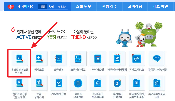 역시 한전 사이버지점 메인페이지에서 '우리집 전기요금 미리보기'를 누릅니다.