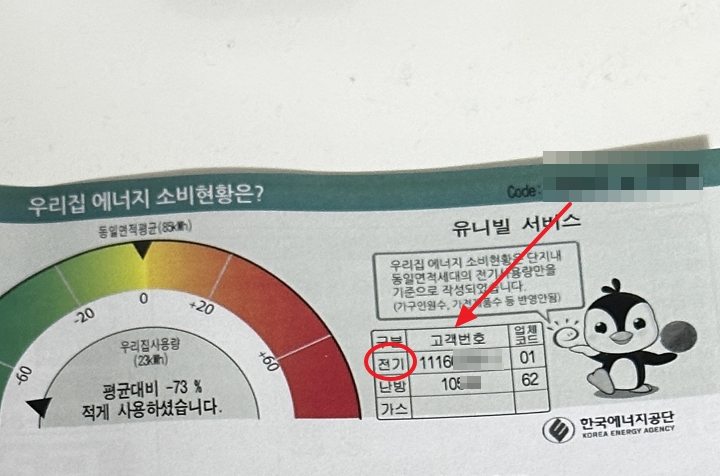 에너지캐시백을 신청하기 위해서 또는 실시간으로 전기요금을 조회하거나 전기관련 정보를 알아보고 싶을 때 필요한 것이 한전 고객번호인데요. 한전 고객번호는 한국전력공사 고객번호의 줄임말입니다. 이는 전기요금 고지서가 있을 경우 또는 아파트 관리비 고지서가 있을 경우에는 쉽게 할 수 있습니다 아래 사진에서 보시는 것처럼 관리비 고지서 상단 우측에 전기 고객번호로 확인할 수 있습니다.
