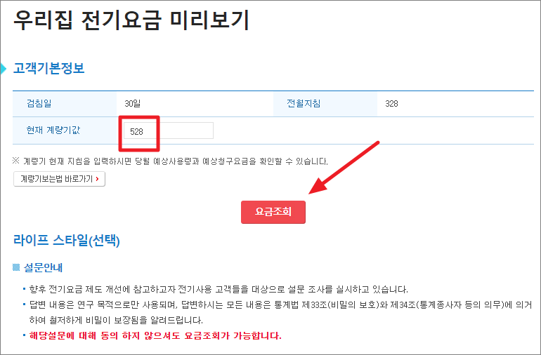 이 때 라이프 스타일(선택) 설문에 동의, 동의하지 않음이 있는데요. 동의하지 않아도 전기요금 조회할 수 있습니다.
