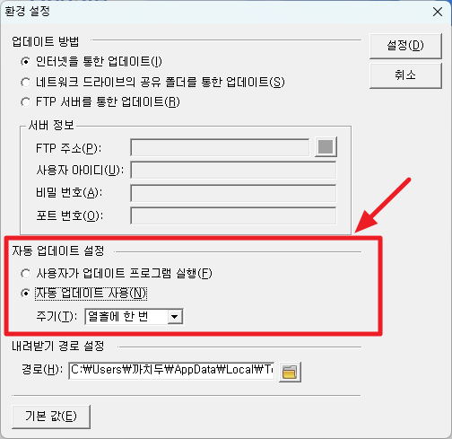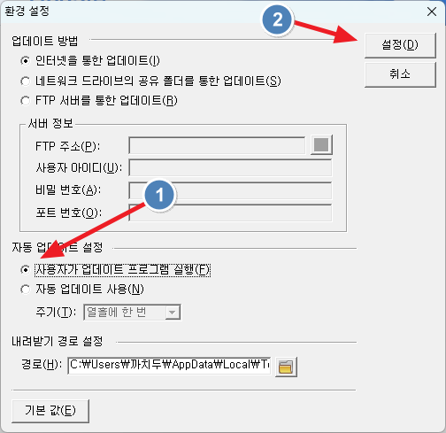 자동 업데이트 설정을 '사용자가 업데이트 프로그램 실행'으로 바꾸고 상단 우측의 '설정'을 누릅니다.