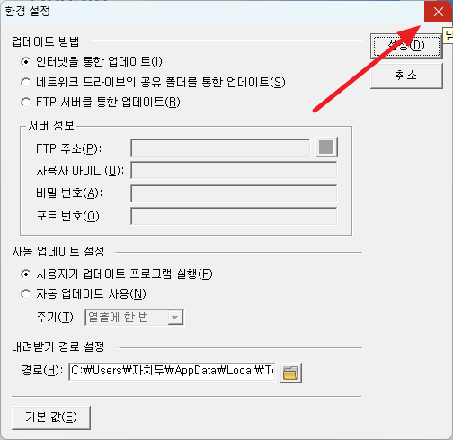 엑스를 눌러서 환경설정 창을 닫습니다.