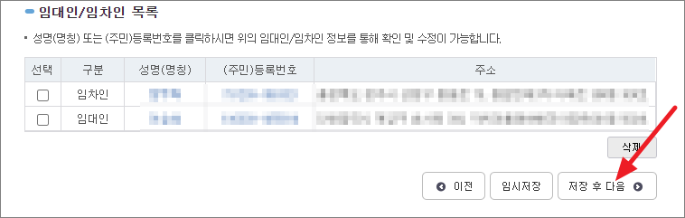 임대인/임차인 목록에 모두 그대로 기재되었으면 아래쪽에 '저장 후 다음'을 누릅니다.