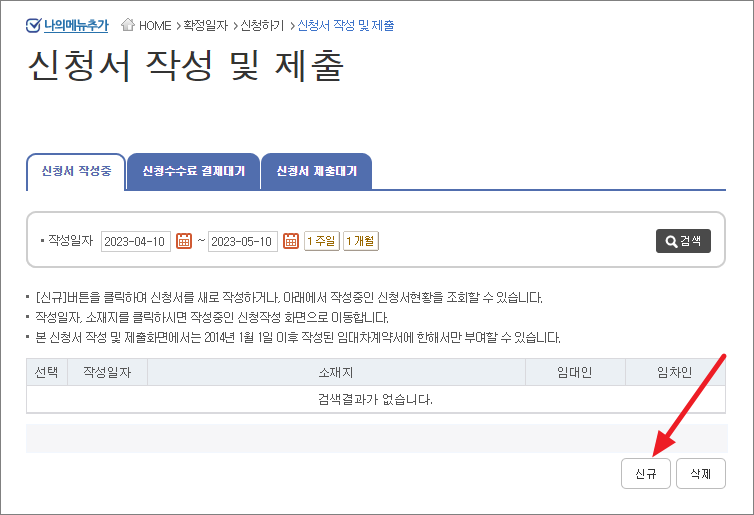 신청서 작성 및 제출 하단에 있는 '신규'를 누릅니다.