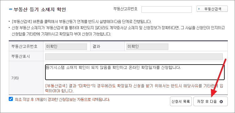 기타란에 '등기시스템 소재지 확인이 되지 않음을 확인하고 온라인 확정일자를 신청합니다'가 자동으로 들어간 것을 확인하고 '저장 후 다음'을 누릅니다.